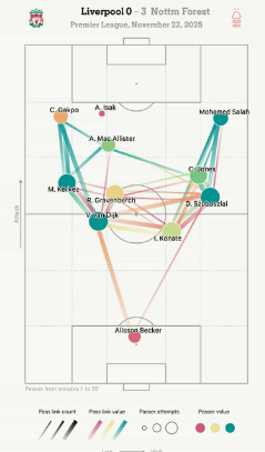 Αυτό το γράφημα, που απεικονίζει τις συνδέσεις πασών της Liverpool το Σάββατο, αντικατοπτρίζει μια ομάδα στην οποία οι συνεργασίες στην επιθετική γραμμή δεν λειτουργούν. Μπορεί κανείς να βρει παρόμοια γραφήματα που αφορούν τον Erling Haaland στη Manchester City, ακόμη και σε αγώνες όπου έχει σκοράρει δύο ή τρία γκολ· όμως αυτή δεν ήταν η εικόνα που φανταζόταν η Liverpool για τον Isak. Θεωρούνταν — όπως και ο Ekitike — παίκτης που θα προσέφερε πιο αξιόπιστη απειλή στο σκοράρισμα από τον αποχωρήσαντα Darwin Nunez, αλλά και έξυπνο, διορατικό, κοφτερό παιχνίδι στη φάση της ανάπτυξης.