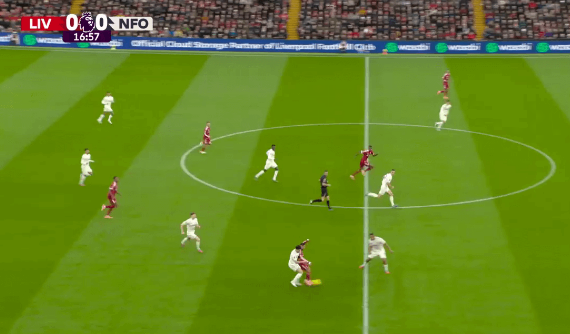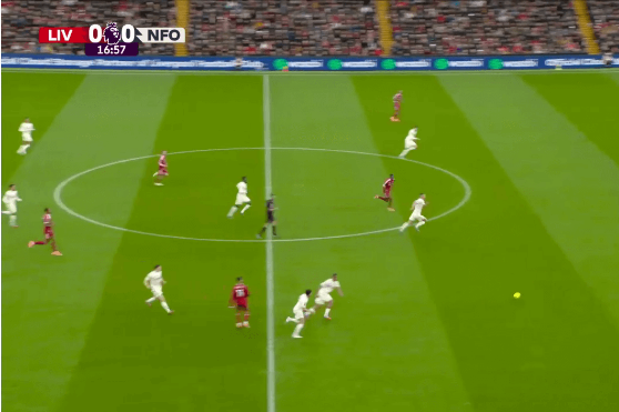 Επτά λεπτά αργότερα, ο Isak μετατοπίστηκε προς τα αριστερά και, αφού πήρε την μπάλα από τον Gravenberch, νίκησε τον Milenković από την εξωτερική πλευρά πριν στείλει μια επικίνδυνη χαμηλή σέντρα, η οποία αποκρούστηκε από τον Murillo. Καθώς η μπαλιά έμεινε «ζωντανή», ο Cody Gakpo θα μπορούσε να έχει σκοράρει, αν δεν υπήρχε μια ακόμη εξαιρετική παρέμβαση. Η άλλη επιλογή για τον Gakpo ήταν να στρώσει την μπάλα στον Isak, ο οποίος είχε πάρει πολύ επικίνδυνη θέση πίσω του, αλλά και πάλι η πάσα δεν ήρθε.