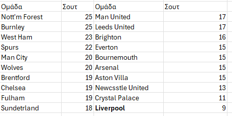 Ας δούμε τον αντίστοιχο πίνακα των ομάδων της Premier League και τα σουτ στο στόχο που αντιμετώπισαν από τις αντίπαλες ομάδες.