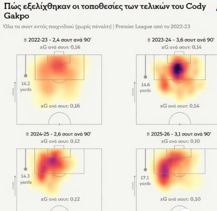 Οι αριθμοί επιβεβαιώνουν όσα δείχνει το μάτι. Ένας βασικός παράγοντας στην πτώση της απόδοσης του Cody Gakpo είναι η επιλογή των τελικών του προσπαθειών. Οι χάρτες σουτ παρακάτω δείχνουν ότι έχει καταφύγει σε περισσότερα βεβιασμένα και χαμηλής ποιότητας τελειώματα, τα οποία εκτελούνται από μεγαλύτερη απόσταση και συγκεντρώνονται κυρίως γύρω από την αριστερή πλευρά της περιοχής, αντί για πιο επικίνδυνες, κεντρικές ζώνες.