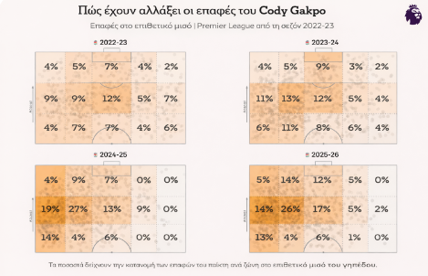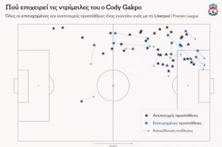 Παράλληλα, δεν έχει καταφέρει να κερδίζει με συνέπεια τον αντίπαλο αμυντικό στο ένας εναντίον ενός. Το ποσοστό επιτυχίας του Cody Gakpo στις ντρίμπλες την περασμένη σεζόν ήταν 50%, όμως φέτος έχει πέσει στο 34%. Από τη στιγμή που ο Arne Slot τονίζει επανειλημμένα τη σημασία της νίκης στις προσωπικές μονομαχίες ως βασικό στοιχείο για το «σπάσιμο» ενός χαμηλού αμυντικού μπλοκ, αυτό αποτελεί ξεκάθαρα λόγο ανησυχίας.