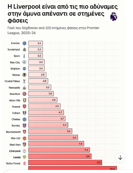 Αν και στην Ευρώπη η εικόνα είναι διαφορετική — η Liverpool έχει σκοράρει τέσσερις φορές από στατικές φάσεις — το γκολ του Nico Gonzalez για τη Manchester City ήταν το έκτο που δέχεται η ομάδα του Arne Slot από στημένη φάση στο πρωτάθλημα. Πρόκειται για ένα από τα χειρότερα ρεκόρ στην κατηγορία.