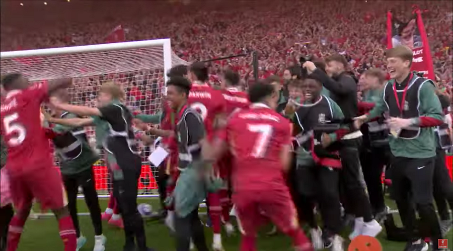 Οι Πρωταθλητές πήγαν όλοι μαζί μπροστά στο Kop, με το μεγάλο γηπεδικό hit των 90s, «Freed from desire» να μπαίνει ξαφνικά στα ηχεία.