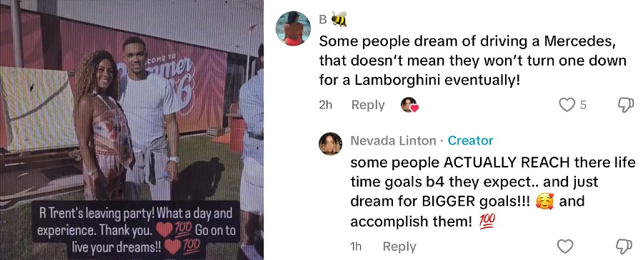 Μία από τις ξαδέρφες του Arnold ανέβασε βίντεο στο Tiktok από το πάρτι – το οποίο έκτοτε διεγράφη – με μία ακόμη να σχολιάζει πως «το ότι όνειρό σου είναι να οδηγήσεις Mercedes δεν σημαίνει ότι κάποτε δεν θα την αφήσεις για μία Lamborghini», θεωρώντας προφανώς ότι η Liverpool δεν είναι αρκετά μεγάλη για τον Trent, με τη δημιουργό του βίντεο να απαντά πως «μερικοί άνθρωποι ΟΛΟΚΛΗΡΩΝΟΥΝ τους στόχους τους πιο πριν από ότι περίμεναν και πάνε για ΜΕΓΑΛΥΤΕΡΟΥΣ στόχους και τους πετυχαίνουν!».