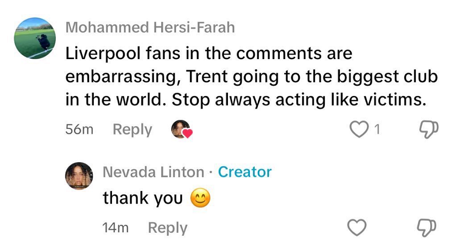 Η έξοδος του Alexander-Arnold ήταν ήδη επεισοδιακή και γίνεται ακόμα χειρότερη. Η ξαδέρφη του έφτασε στο σημείο να αλλάξει όνομα στον λογαριασμό της στο TikTok, χωρίς όμως να μπορεί να αποφύγει τα σχόλια από τους εξοργισμένους οπαδούς της Liverpool για την ανεπανάληπτη επίθεση προς τους ίδιους, τον σύλλογο, την πόλη και τη τραγωδία του Hillsborough.
