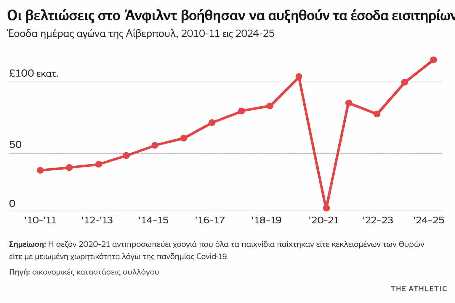 Στην κορυφή των οικονομικών στοιχείων, τα έσοδα της Liverpool αυξήθηκαν και στις τρεις βασικές πηγές εισοδήματος — εισιτήρια αγώνων, τηλεοπτικά δικαιώματα και εμπορικές συμφωνίες — κάτι που μόνο η Arsenal κατάφερε επίσης την περασμένη σεζόν μεταξύ των λεγόμενων «Big Six» της Premier League.