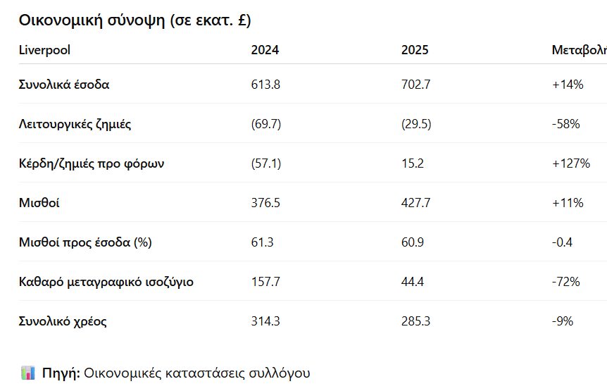 Η επιστροφή της Liverpool στην κορυφή της Premier League την περασμένη σεζόν συνοδεύτηκε και από επιστροφή στην κερδοφορία. Τα οικονομικά στοιχεία της σεζόν 2024-25, που δημοσιεύθηκαν την περασμένη Πέμπτη, αποκάλυψαν τη βάση πάνω στην οποία στηρίχθηκε το μεταγραφικό «όργιο» ύψους 400 εκατομμυρίων λιρών το περασμένο καλοκαίρι.