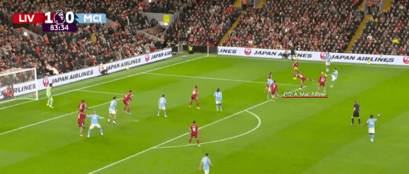Η αδύναμη προσπάθειά του να μπλοκάρει τη σέντρα του Rayan Cherki προς την περιοχή, από την οποία προήλθε η ισοφάριση του Bernardo Silva, δεν ήταν τόσο σοβαρή όσο αυτό που ακολούθησε, αλλά ήταν αρκετά επιζήμια. Ο Mac Allister άπλωσε το δεξί του πόδι και γύρισε την πλάτη του στη φάση, τη στιγμή που η Liverpool χρειαζόταν κάποιον να αντιμετωπίσει κατά μέτωπο τη σέντρα και να την απομακρύνει οριστικά.