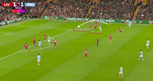 Όπως δείχνει και το παρακάτω στιγμιότυπο, οι Mac Allister και Jones πιάστηκαν να παρακολουθούν την μπάλα, επιτρέποντας στον Matheus Nunes να μπει ανενόχλητος μέσα στην περιοχή.