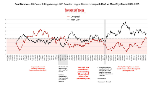 Έχω εξετάσει παλαιότερα το Ισοζύγιο Φάουλ από το 2022 και μετά, επειδή τότε άρχισα να αισθάνομαι ότι η Liverpool αντιμετωπιζόταν άδικα. Πριν από αυτό, δεν είχα ποτέ ξανά αυτή την αίσθηση σε σχεδόν κάθε αγωνιστική.