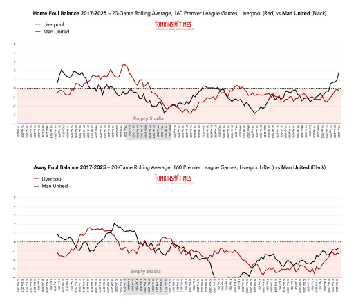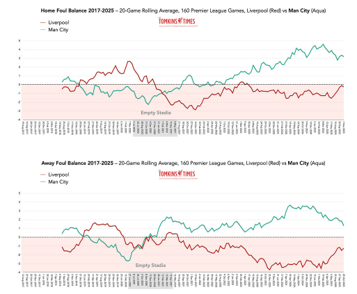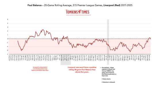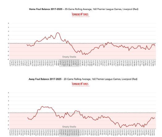 Μακριά από το σπίτι, οι Reds τιμωρούνται αδίστακτα από τους διαιτητές στο Ισοζύγιο Φάουλ Δεν έχει υπάρξει σχεδόν ποτέ πάνω από το μηδέν από τον Ιανουάριο του 2020, και για δύο χρόνια κυμαινόταν γύρω στο -4 ανά παιχνίδι, μέχρι το τέλος της περσινής σεζόν (όταν ο τίτλος είχε ήδη κριθεί).